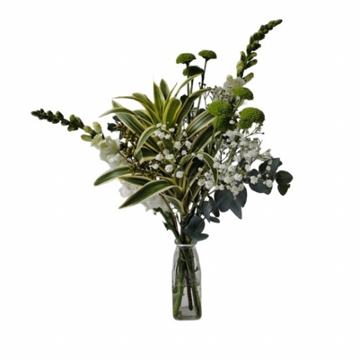 A combinação de flores verde e branco é clássica e elegante, perfeita para eventos como casamentos e decorações em geral, pois cria uma atmosfera de serenidade e sofisticação