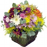 Um lindo arranjo composto por 10 gérberas coloridas, chuva de prata, junco e folhagem em um balde com 1 urso de pelúcia.
