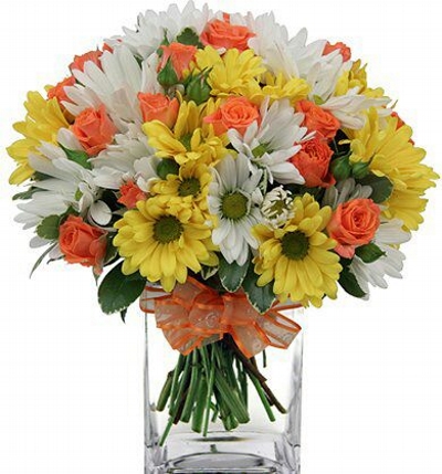 Margaridas brancas e amarelas com Rosas laranjas em vaso de vidro