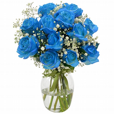 Um lindo arranjo de rosas azuis e chuva de prata em vaso