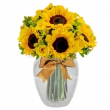 Um lindo arranjo com 3 rosas, junco, tango e folhagem em um lido cachepô de madeira + ferrero.