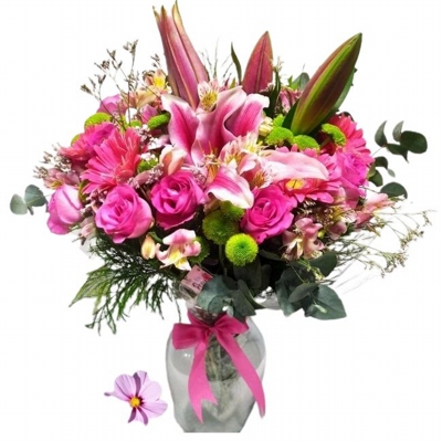 Lírios Rosas, Rosas Rosas, Gérberas Rosas, Astromélias Rosas, Sempre Viva Bolinha Verde e Folhagens