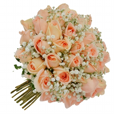 Um lindo buquê com 30 rosas champanhe e chuva de prata envolvido com fita de cetim.